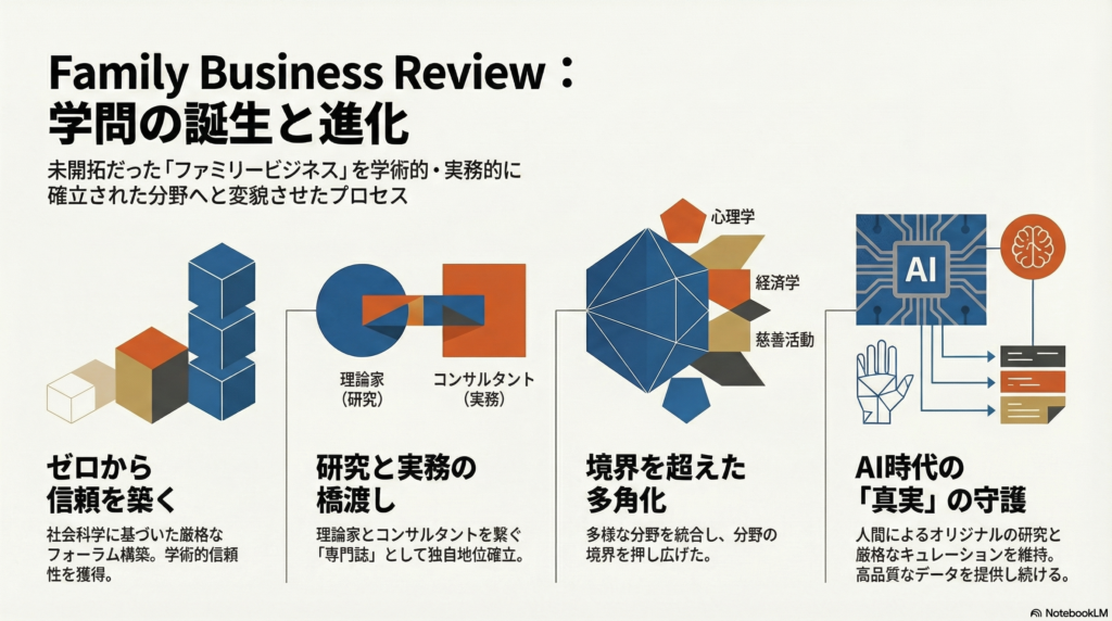 今日、多くの大学や専門機関で研究されている「ファミリービジネス」ですが、かつてはこの分野が独立した学問として認められていなかった時代がありました。今回は、FFI(Family Firm Institute)が配信している、”FFI Practitoner”のポッドキャスト4月1日号の対談を要約して、この分野の発展に決定的な役割を果たした学術誌『Family Business Review (FBR)』の歴史を振り返りながら、実務と学術がどのように統合されてきたのかを紐解きます。